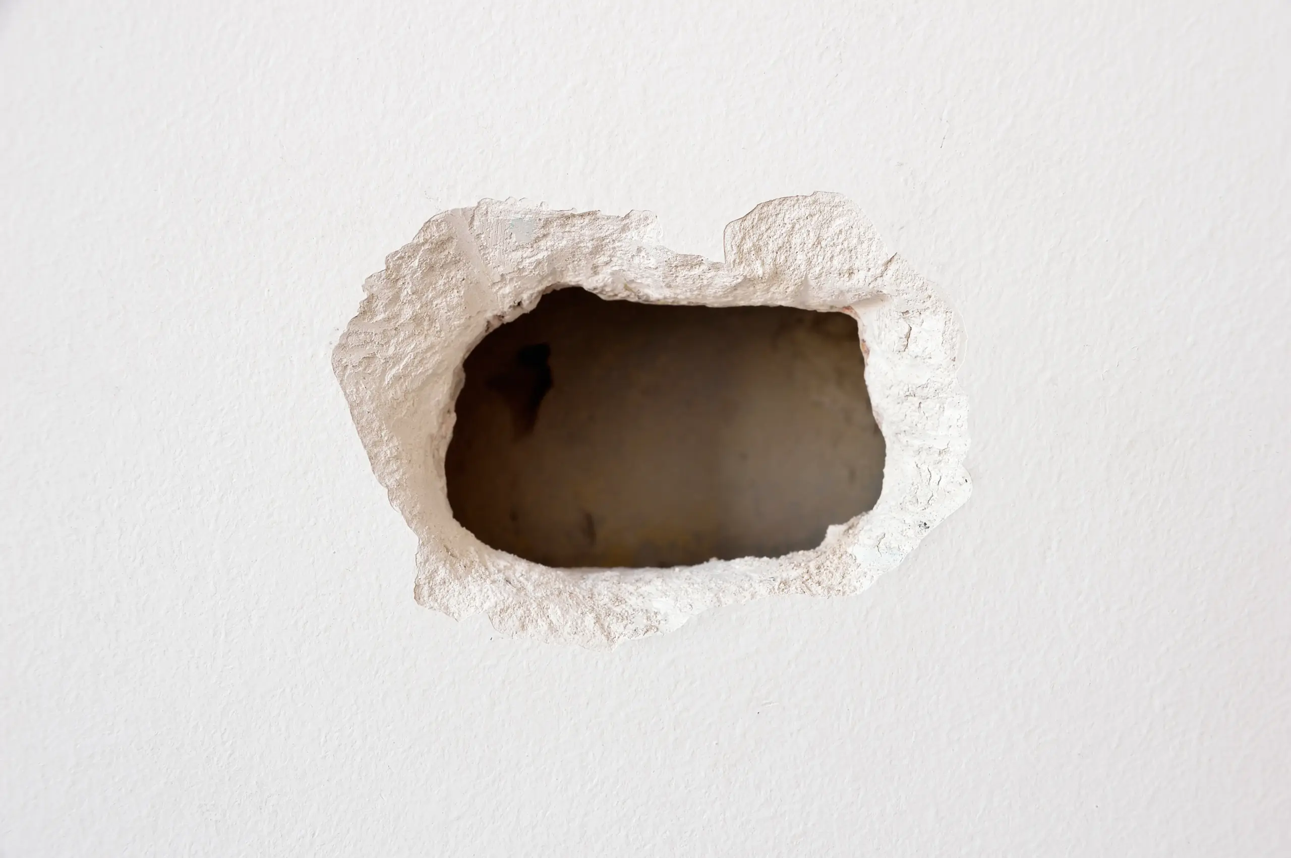 お風呂を出てリビングに行った時、目を疑いました。壁にマンションの地肌が見えるほどの、深く大きな穴が開いていたのです。床には砕け落ちた壁の材質が、粉々になって落ちていました。